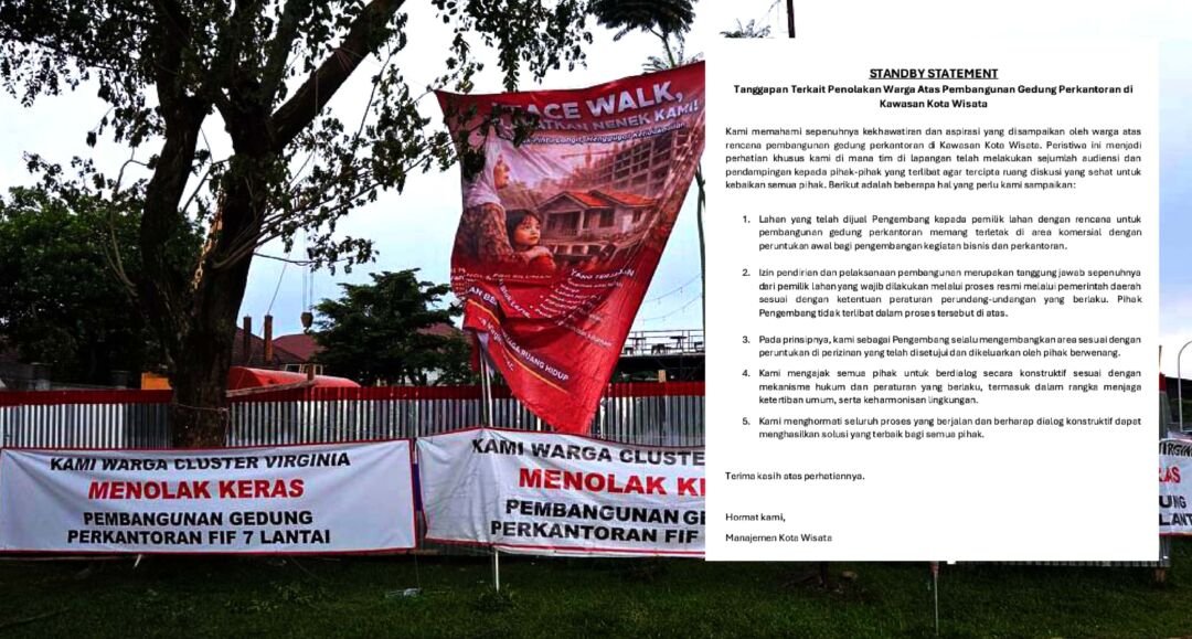 Tanggapan Terkait Penolakan Warga Atas Pembangunan Gedung Perkantoran di Kawasan Kota Wisata, Kami memahami sepenuhnya kekhawatiran dan aspirasi yang disampaikan oleh warga atas rencana pembangunan gedung perkantoran di Kawasan Kota Wisata. Peristiwa ini menjadi perhatian khusus kami di mana tim di lapangan telah melakukan sejumlah audiensi dan pendampingan kepada pihak-pihak yang terlibat agar tercipta ruang diskusi yang sehat untuk kebaikan semua pihak.