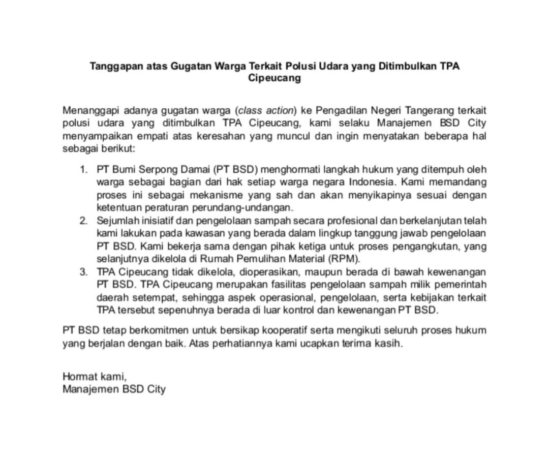 Menanggapi adanya gugatan warga (class action) ke Pengadilan Negeri Tangerang terkait polusi udara yang ditimbulkan TPA Cipeucang, kami selaku Manajemen BSD City menyampaikan empati atas keresahan yang muncul dan ingin menyatakan beberapa hal sebagai berikut: